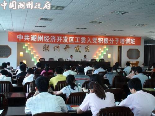 今天由开发区党工委举办的入党积极分子培训班开学了。这次培训学习活动的目的,是引导同志们学到更全面,更具体的党的基本理论和基本知识。通过学习,使同志们在工作生活中用共产党员的标准严格要求自己、规范自己,在实践中不断了解我党的伟大与光荣,为党的工作贡献自己最大力量,为党的事业添砖加瓦,为建设幸福潮州、为开发区建设更上一层楼做出新贡献。