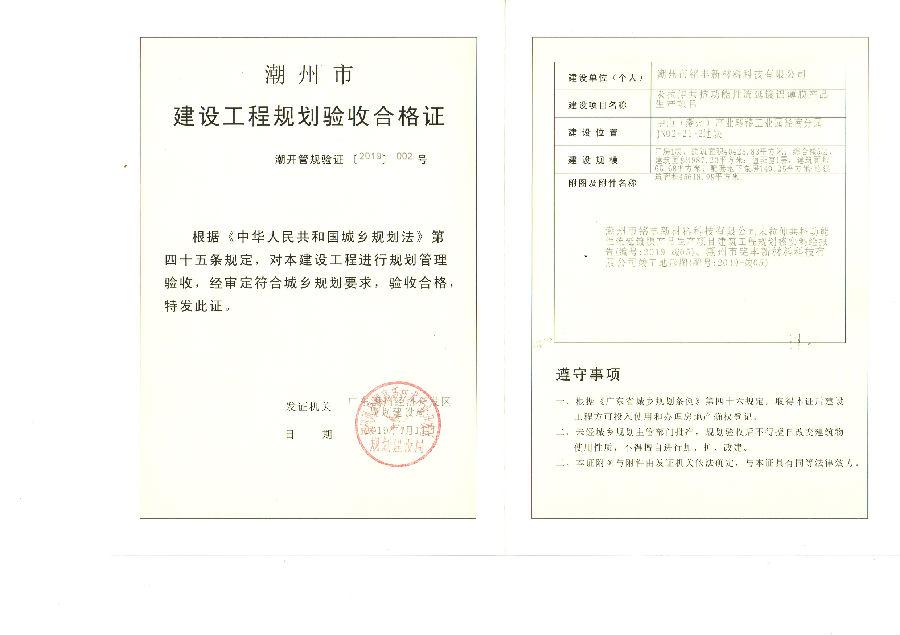 潮州市铭丰新材料科技有限公司未拉伸共挤功能性流延镀铝薄膜产品生产项目《建设工程规划验收合格证》公示