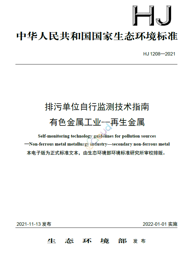 五、《排污单位自行监测技术指南 有色金属工业—再生金属》(HJ 1208-2021)