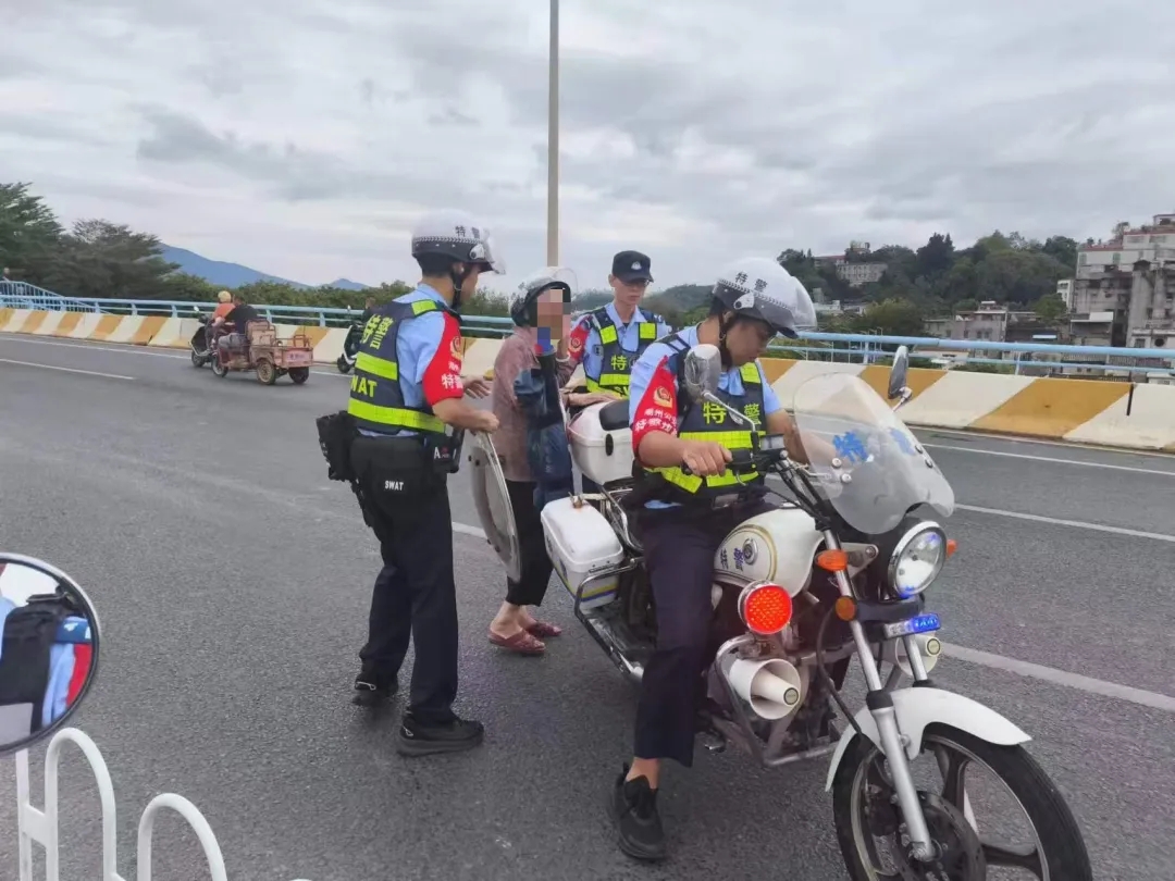 10月20日18时46分,市局巡警特警支队“红袖章”队员巡逻至南堤路时,发现一名老人在车道上徘徊,当时天色昏暗,路上车来车往,险象环生。“红袖章”队员见状立即上前将老人带至路边。但因该老人精神恍惚,没法联系到家属,仅能大概说出其居住位置。 “红袖章”队员用摩托车载老人到其说出的大概位置附近寻找,最后在环城路水关脚附近居民楼,见到认识该老人的群众,并协助将老人安全送至家中,同时叮嘱老人家属要看管好老人。 10月21日13时46分,正在巡逻的市局巡警特警支队“红袖章”队员接市110指挥中心通报,金山大桥上发现一名老阿婆独自行走在路中间,十分危险。 “红袖章”队员迅速前往现场并将老人安全护送至桥下,并与追寻定位到场的老人家属相遇。