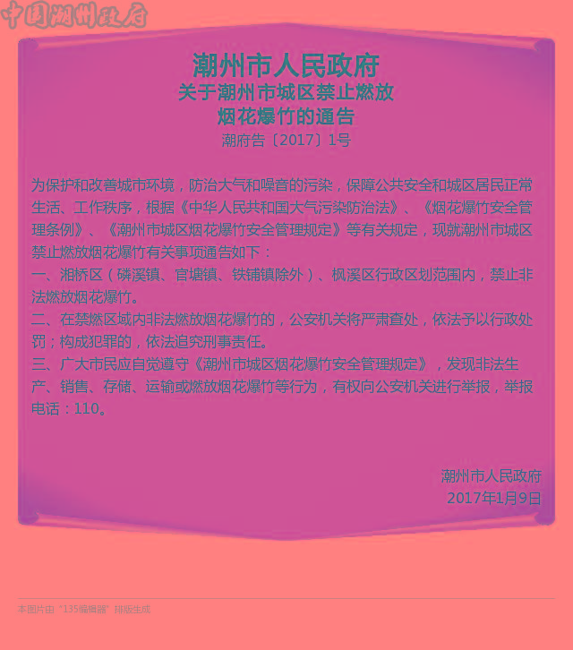 关于潮州市城区禁止燃放烟花爆竹的通告