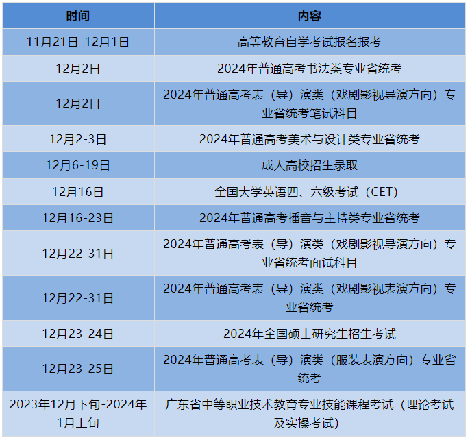 12月招生考试历出炉啦,赶紧收藏吧!