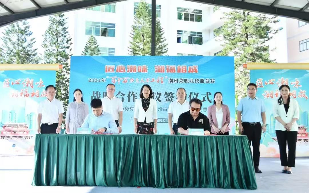 此次竞赛不仅是技能的比拼,更是人才选拔的良机。对于在竞赛中脱颖而出的选手,现场还举行了获奖选手与用人单位聘用仪式,促进潮菜乡土人才与知名餐饮企业的对接与合作,为获奖选手提供优质的就业机会,实现技能与岗位的精准匹配,为优秀烹饪人才提供了更广阔的发展空间和职业舞台。当天,现场还举行深圳报业电子商务有限公司与湘桥区乡村振兴局以及潮州古城牛肉丸文化创意园战略合作签约仪式、深圳市紫元元公益慈善基金会捐赠仪式,并为“潮州菜实训基地”授牌,进一步推动湘桥潮菜产业创新发展,赋能乡村振兴。