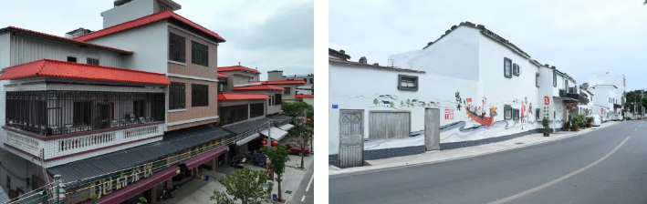转角遇景,建筑立面展新颜。漫步官塘镇街巷,外立面提升工程让圩镇焕然一新。1600米长的屋面挡雨批檐为建筑增添了立体感,而精心绘制的墙绘则与整治后的河道景观相映成趣。在规整的统一基调上,本地人文和历史元素被深度挖掘,道路节点处的历史文化景墙、艺术墙绘和景观小品,共同讲述着属于官塘的独特故事。