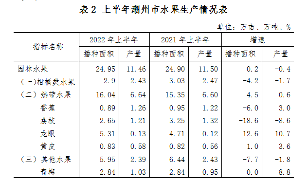 水果生产有所减弱。受5-6月份持续降雨影响,截至二季度末,全市园林水果播种面积24.95万亩,同比增长0.2%;总产量11.46万吨,下降0.4%,实现产值4.98亿元,同比下降0.4%。其中:柑橘类水果产量2.43万吨,下降1.7%;香蕉产量1.26万吨,增长3.0%;荔枝产量1.21万吨,下降8.6%;桑葚、杨梅、青梅、莲雾等其他水果合计产量2.39万吨,下降1.8%。(见表2)