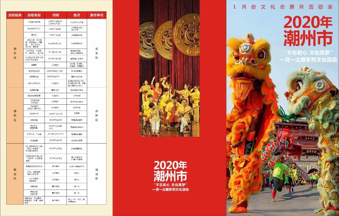 2020年潮州市“不忘初心 文化筑梦”一月一主题系列文化活动一月份文化志愿月活动由市文广旅体局牵头组织,市直和各县区相关单位共同实施举办。据市文化广电旅旅体育局局长伍茸介绍:活动包括启动仪式、文化展览、文艺轻骑兵等七大板块共66项活动。具体有:文化展示展演板块的彩瓷精品展、非物质文化遗产展、美术书法摄影展、新年音乐会、传统工艺体验活动等;文艺轻骑兵板块的文艺演出、百姓讲堂公益讲座、戏曲、送春联走进乡村、社区和军营等;饶平县、潮安区、湘桥区和枫溪区各板块的书画摄影展览、非遗展、文艺演出、音乐会、灯谜会猜、潮剧潮曲表演、潮州大锣鼓、舞龙、舞狮巡游、广场舞、电影放映等形式多样、主题突出、群众参与的喜闻乐见的主题文化活动,为我市营造欢乐祥和、昂扬向上的良好氛围。