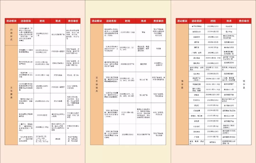 2020年,我市将组织“不忘初心 文化筑梦”一月一主题系列文化活动,通过每月举办展示展演、文化惠民、赛事等活动,重点宣传展示一个文化主题内容,打造文化特色品牌,增强潮州城市文化软实力和综合竞争力。