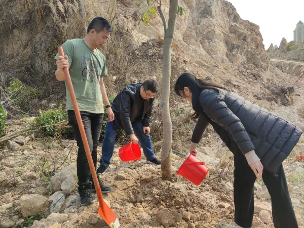 局党组成员、副局长辜美加一行带着树苗、铁锹、锄头、水桶来到植树地点,干劲十足地一起劳动。大家分工协作、密切配合,有的挖坑、有的扶苗、有的填土、有的浇水……现场一片热火朝天。经过一个多小时共同的努力,大家很快就完成了植树任务。一株株新栽的树苗在阳光下昂然矗立,枝干上的新叶在风中摇曳,一片生机盎然。