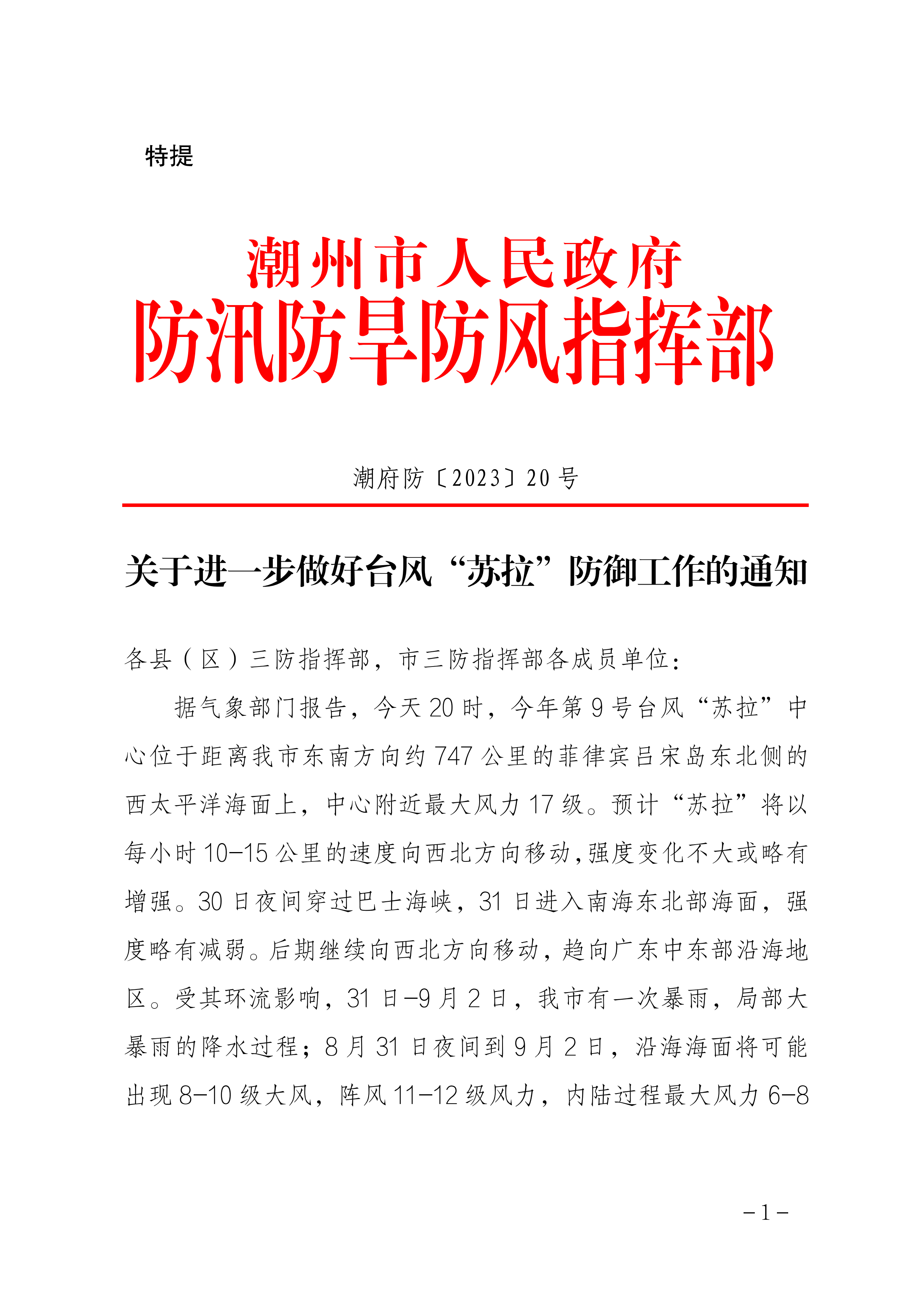 潮府防20 关于进一步做好台风“苏拉”防御工作的通知