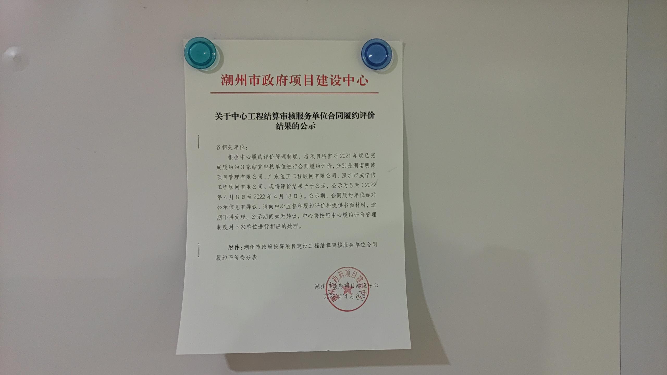 关于中心工程结算审核服务单位合同履约评价结果的公示