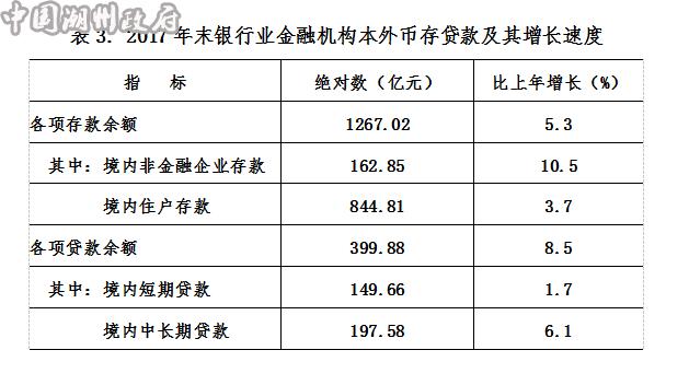银行贷款增速提高。2017年末,全市金融机构本外币存款余额1267.02亿元,比上年增长5.3%;其中住户存款余额844.81亿元,比上年增长3.7%。金融机构本外币贷款余额399.88亿元,比上年增长8.5%,增速比上年提高8.6个百分点;其中,中长期贷款186.2亿元,比上年末下降1.5%。存贷比为31.6%,比上年提高1个百分点。